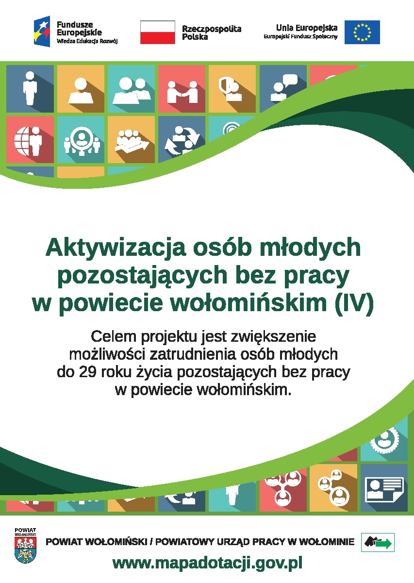 Wysokość dofinansowania z Funduszy Europejskich w latach 2020-2022 wynosi 84,28% wartości projektu.Celem projektu jest zwiększenie możliwości zatrudnienia osób młodych do 29 roku życia pozostających bez pracy w powiecie wołomińskim.