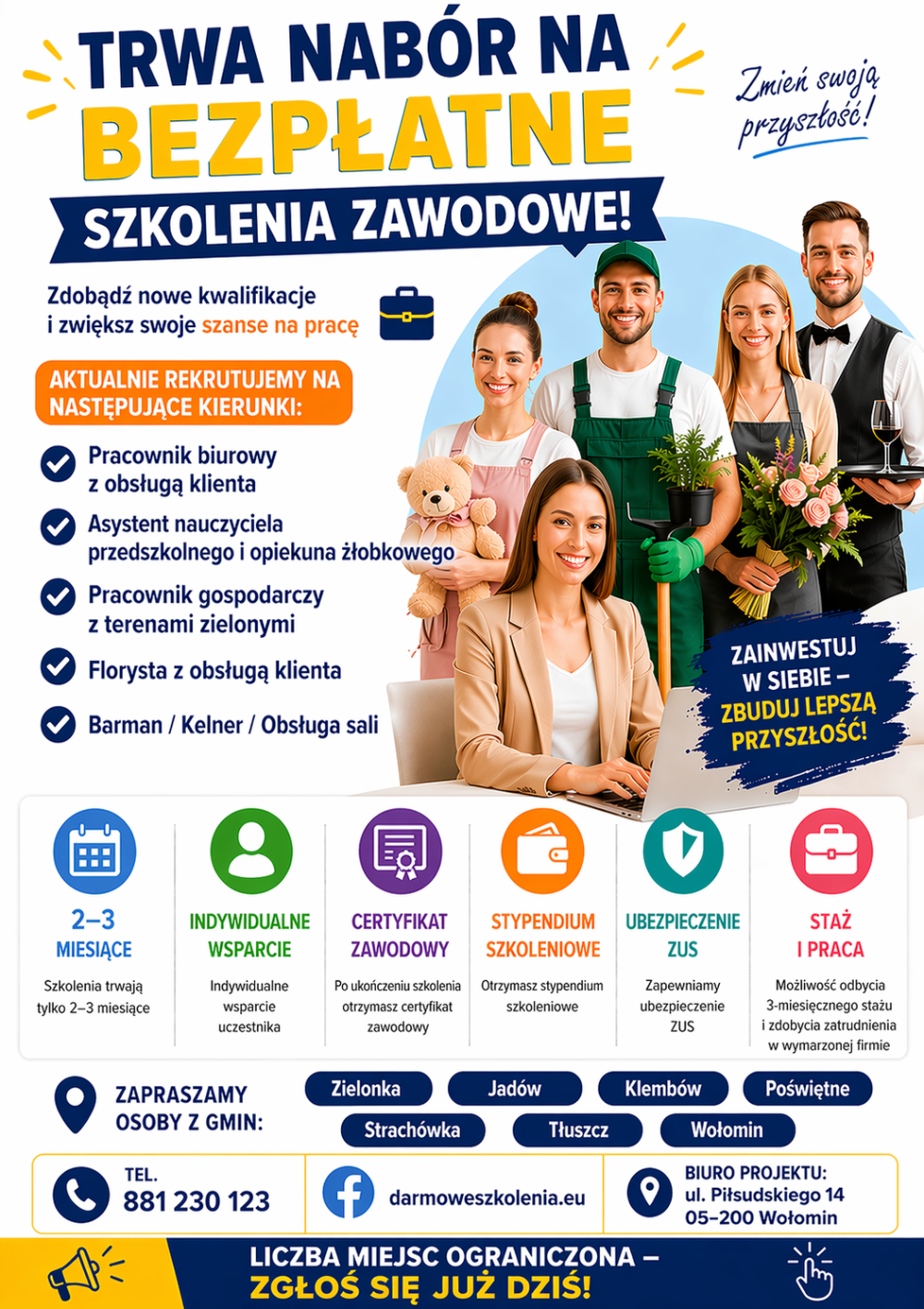 CELEM GŁÓWNYM jest podwyższona aktywność społeczna i zawodowa oraz zwiększona zdolność do podjęcia zatrudnienia przez 36(22K/14M)dorosłych osób fizycznych pozostających bez zatrudnienia, w tym min. 7os.(5K/2M) w wieku do 29r.ż.NEET; w tym min.5ON(4K/1M )- zagrożonych ubóstwem i wykluczeniem społecznym zamieszkujących (w rozumieniu Kodeksu Cywilnego) na obszarze LGD "Równiny Wołomińskiej"; prowadząca do uzyskania kwalifikacji przez 36os.(22K/14M), podjęcia pracy przez min.10os.(6K/4M) oraz poszukiwaniem zatrudnienia przez min. 14os.(9K/5M); dzięki objęciu zindywidualizowanym i kompleksowym wsparciem w okresie 01-09.2026